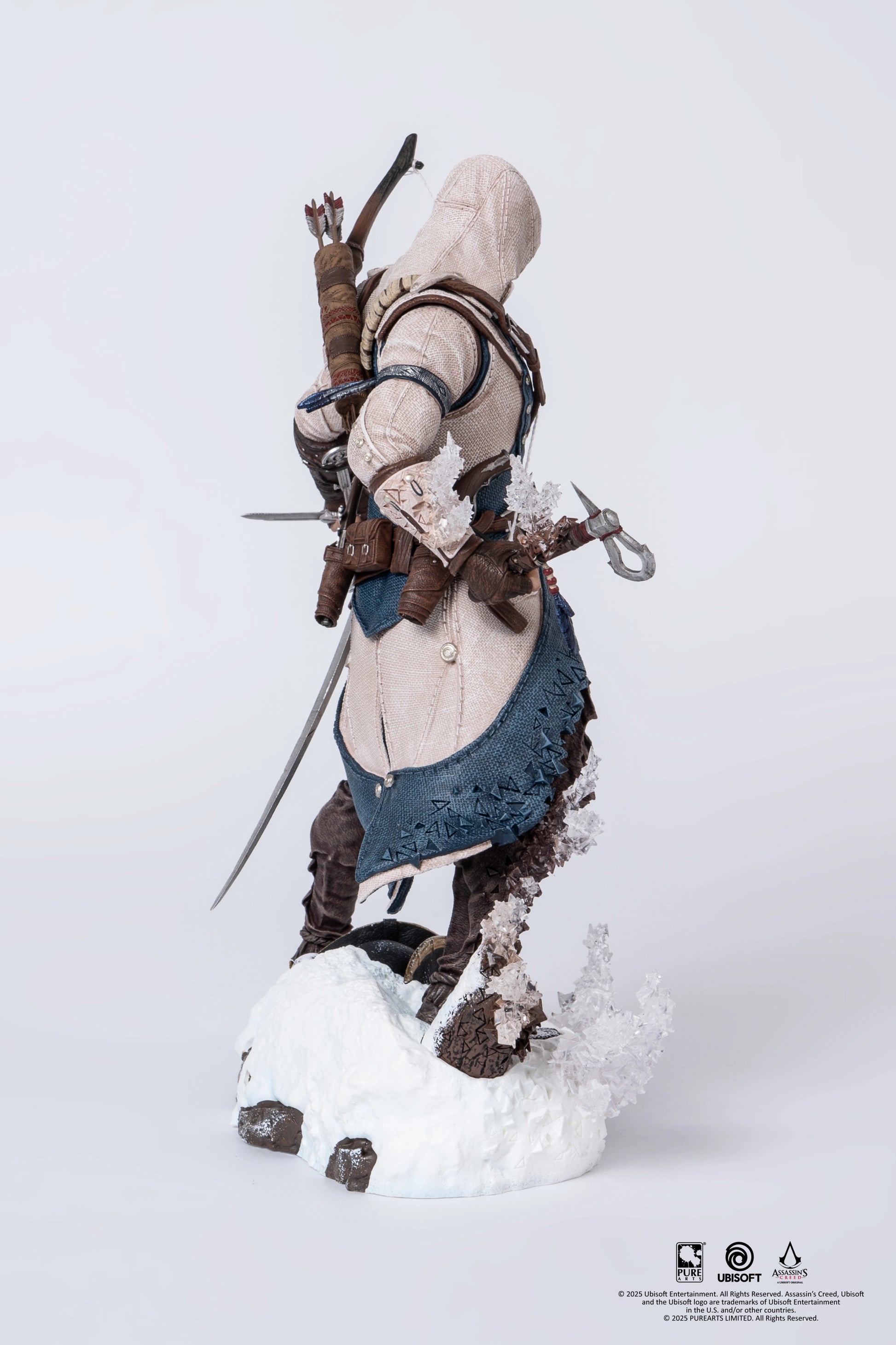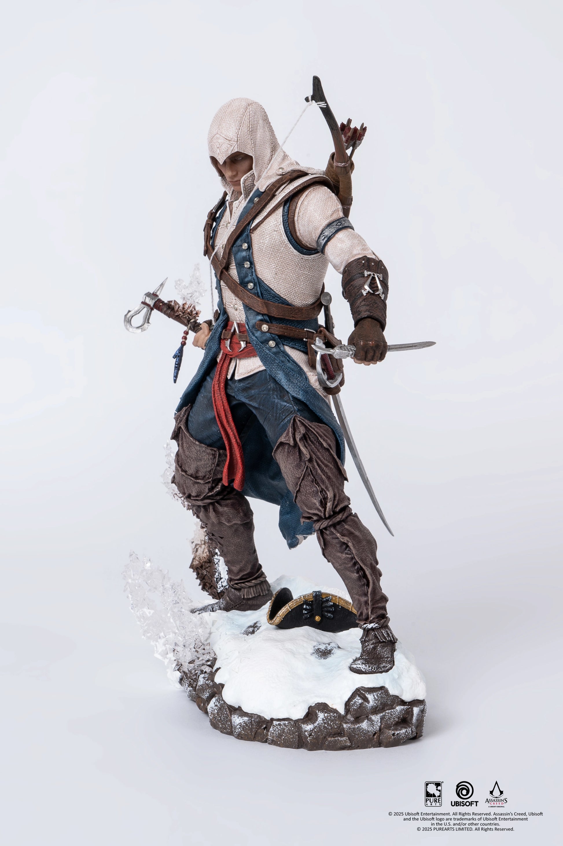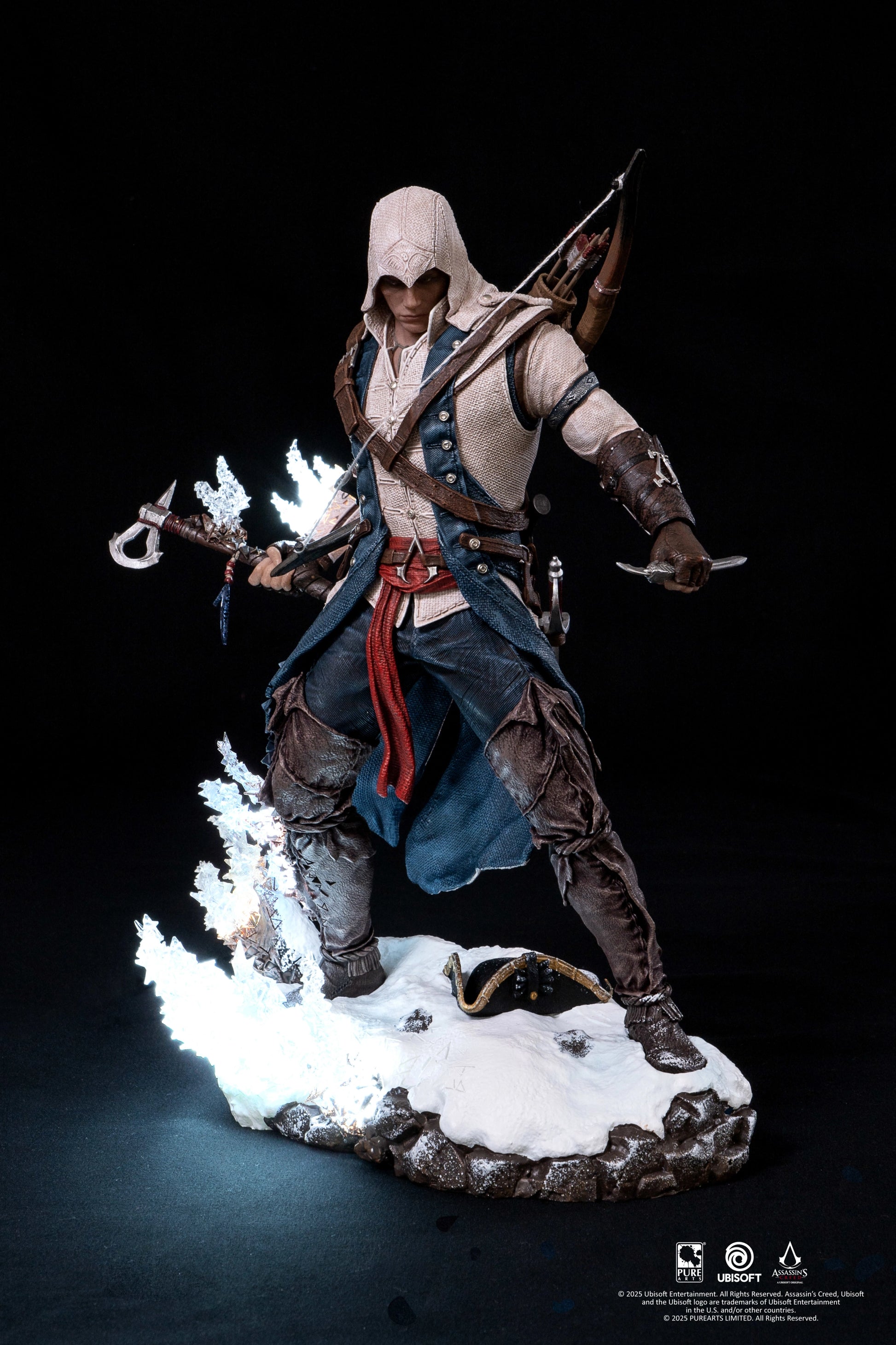 Bohater Assassin's Creed III, Connor, jest gotowy do walki w zaśnieżonym amerykańskim lesie, z tomahawkiem w dłoni i czapką poległego brytyjskiego żołnierza u stóp. Kwintesencja efektu animus-LED PureArts, reprezentującego pomost między przeszłością a teraźniejszością, materializuje się po lewej stronie Connora. Mierząca 11 cali wysokości statua Animus Connor 1/8 Scale Statue to idealny rozmiar dla każdego fana Assassin's Creed!