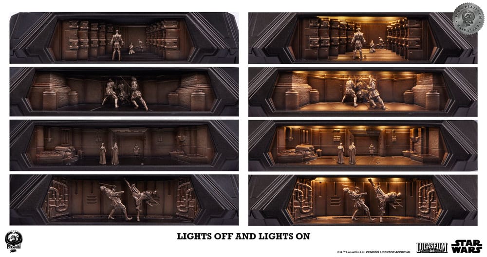 - Statua znajduje się na cokole ozdobionym czterema unikalnymi płaskorzeźbami z dramatycznym oświetleniem LED, z których każda przedstawia ważne sceny z klasycznego filmu STAR WARS: EPIZOD I - MROCZNE WIDMO