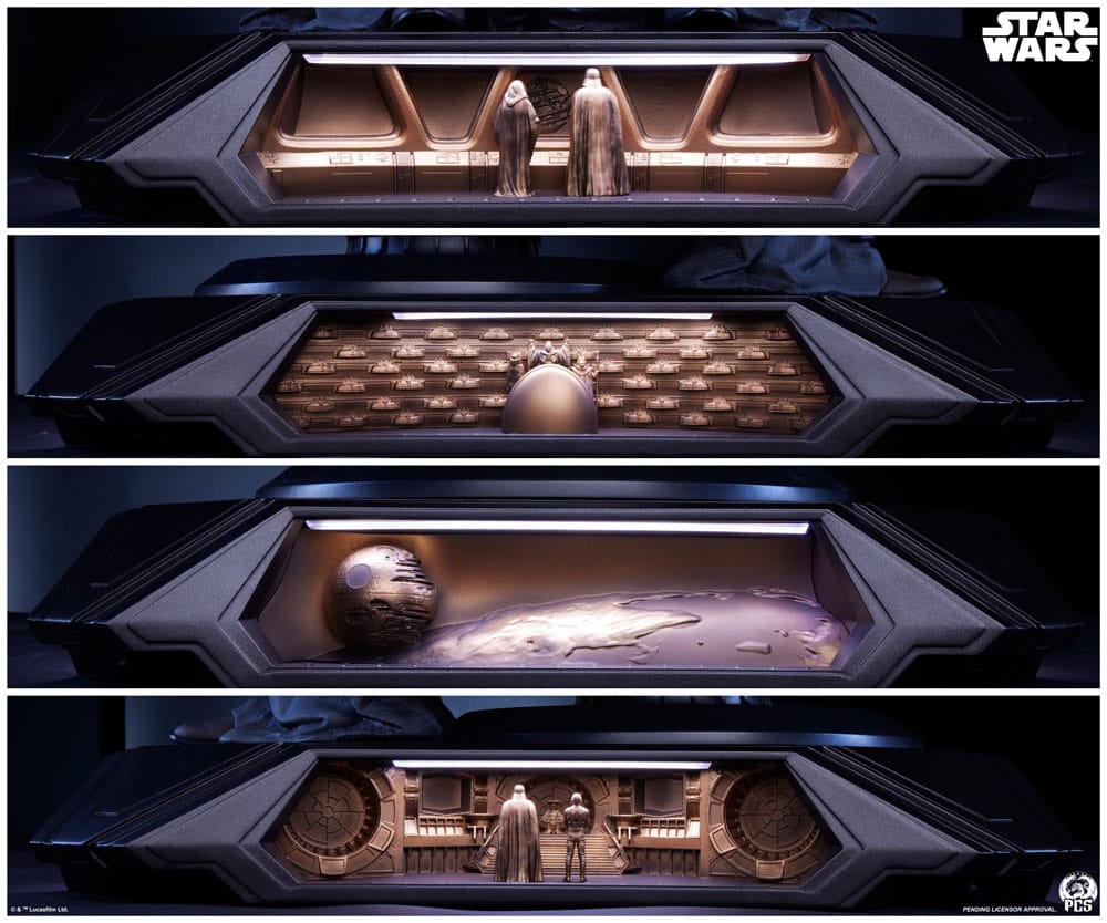 - Podstawa jest ozdobiona czterema unikalnymi scenami reliefowymi z efektownym podświetleniem LED, z których każda przedstawia ważne sceny z sagi STAR WARS™